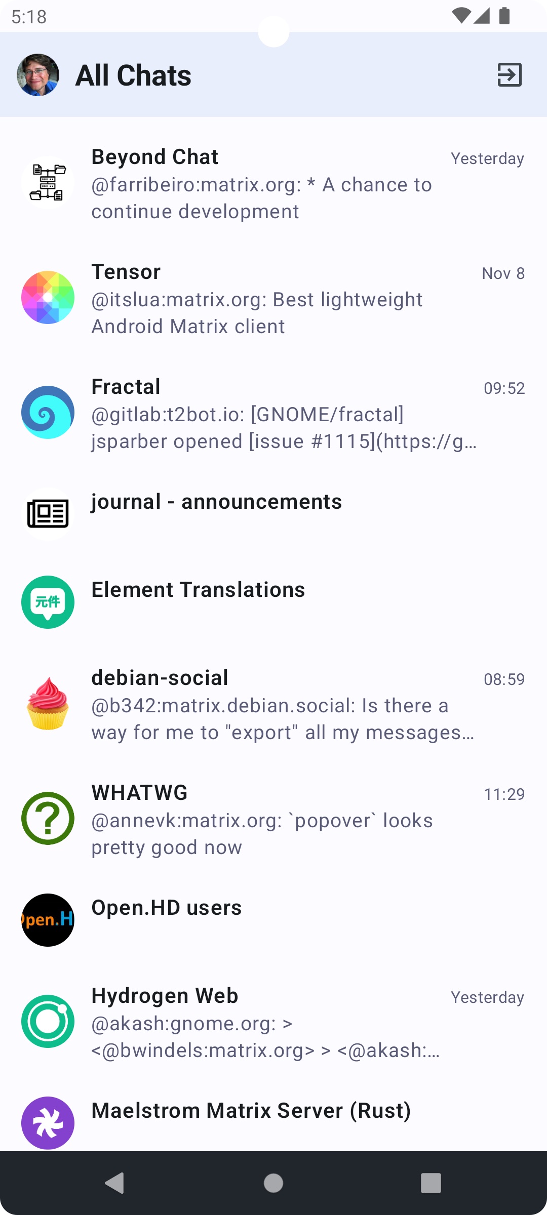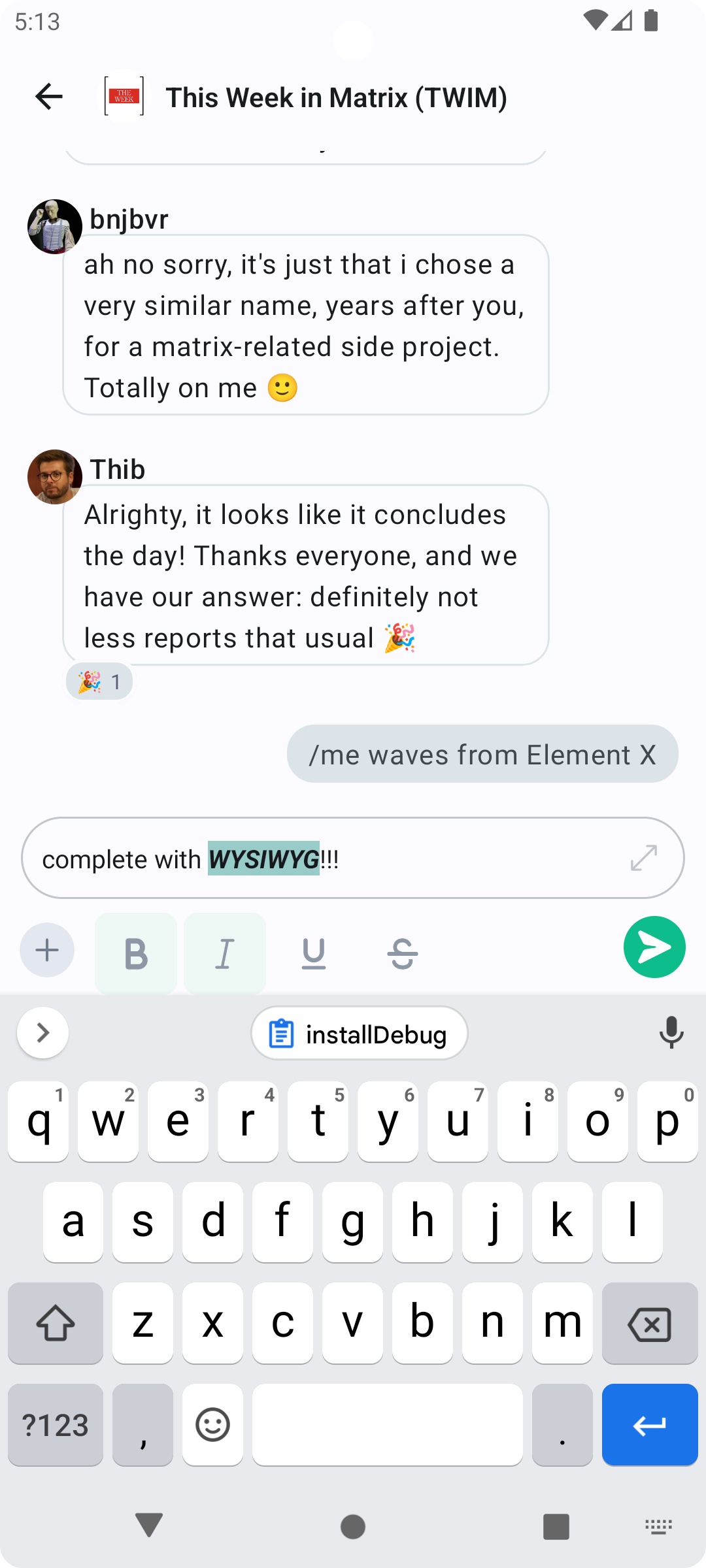 • Release candidate 1.5.4 is available for the tester on the PlayStore. It includes a lot of new features, most of them behind lab flags: new device management, new WYSIWYG editor, Voice broadcast, etc. Also the application is now targeting Android 13 devices. Please refer to the full changelog for more details.