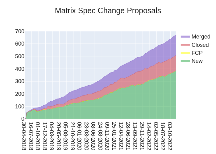 This week and the week afterwards, the Spec Core Team are mostly focused on improvements to Matrix that we'd like to show off at FOSDEM 2023 this year! That consists of MSCs related to Faster Room Joins (MSC3943 among others) and Extensible Events (MSC1767).