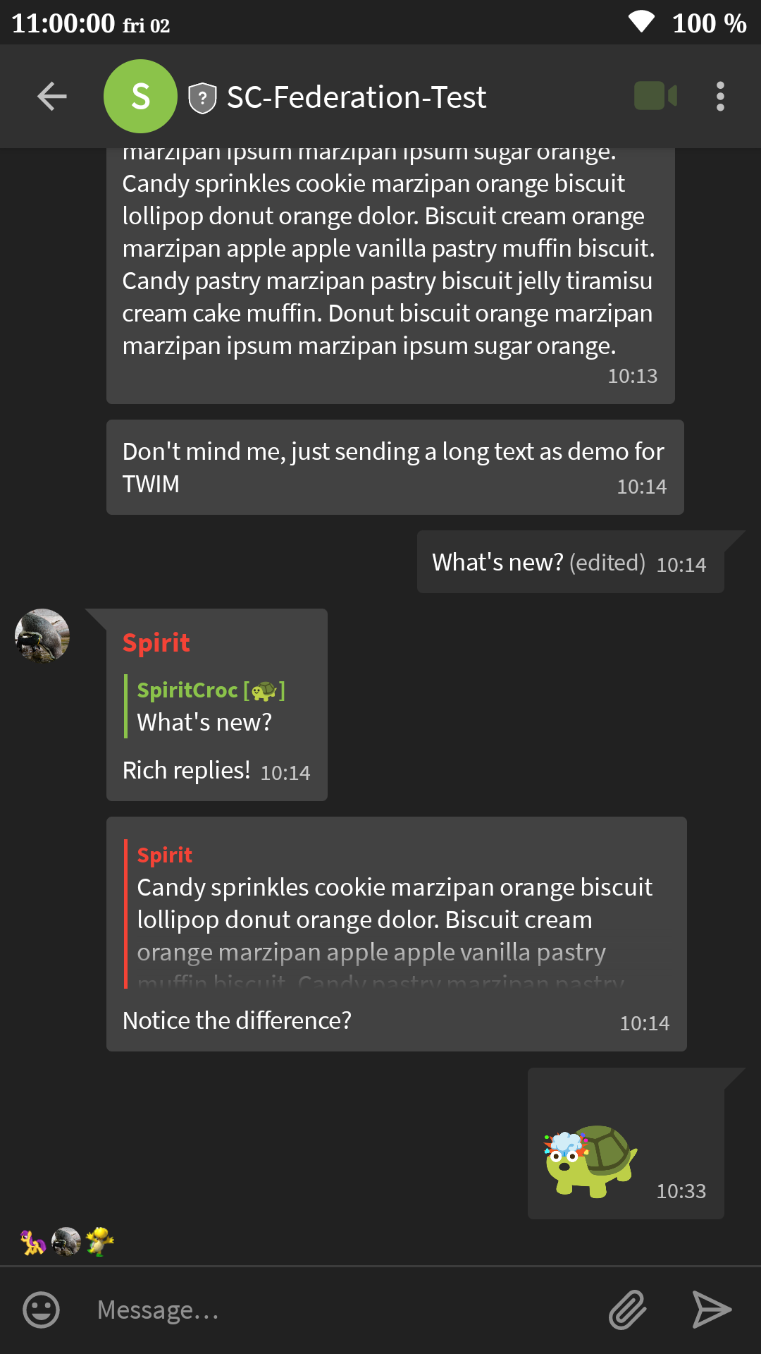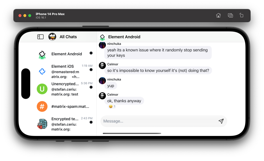 🏗️ On the ElementX side we have been working on a Reactions picker, the timeline rewrite is almost finished, work on a split view layout for iPad continues and we’re finishing up a shiny new Room Details screen.